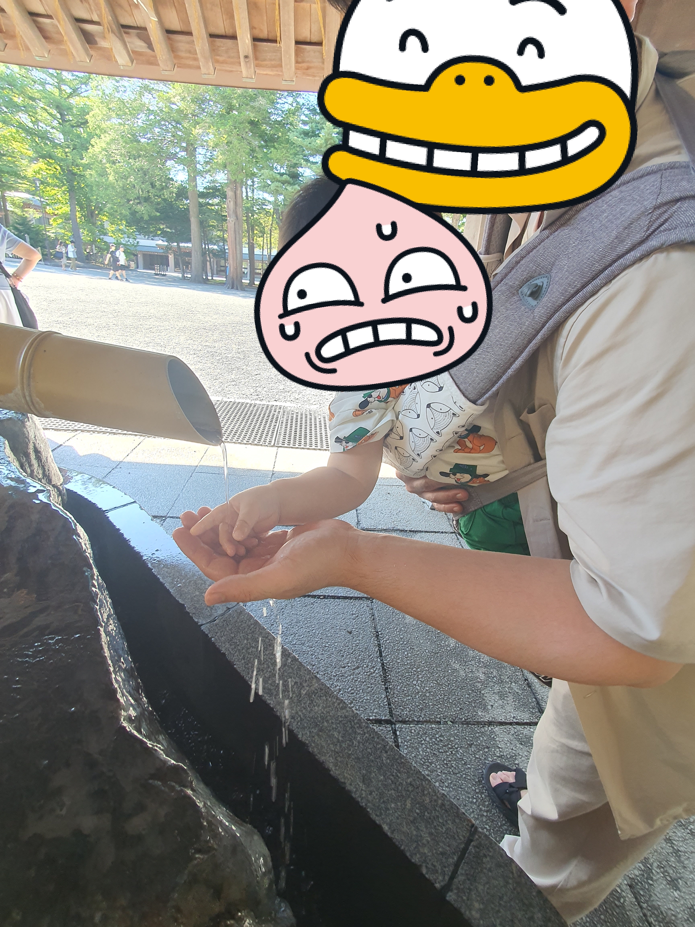 손은 신사 입구에 물이 나오기도 하고, 주차장쪽에 화장실에 비누랑 있어요. 아기가 좋아한다면 놀다가도 나쁘지 않겠네요.