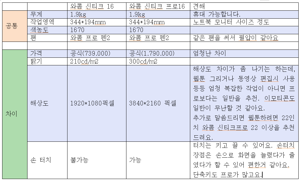 와콤 신티크 16과 와콤 신티크 프로 16 차이